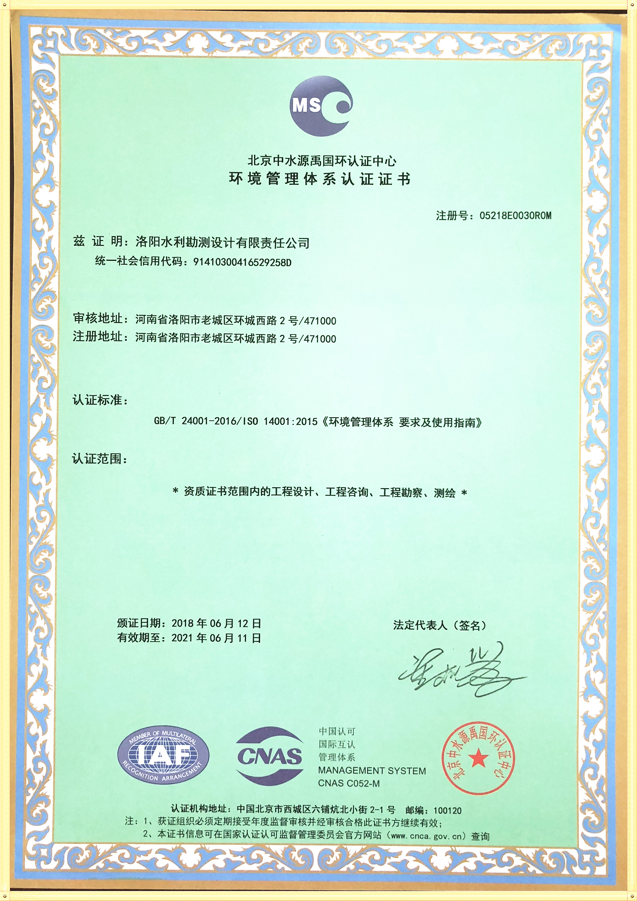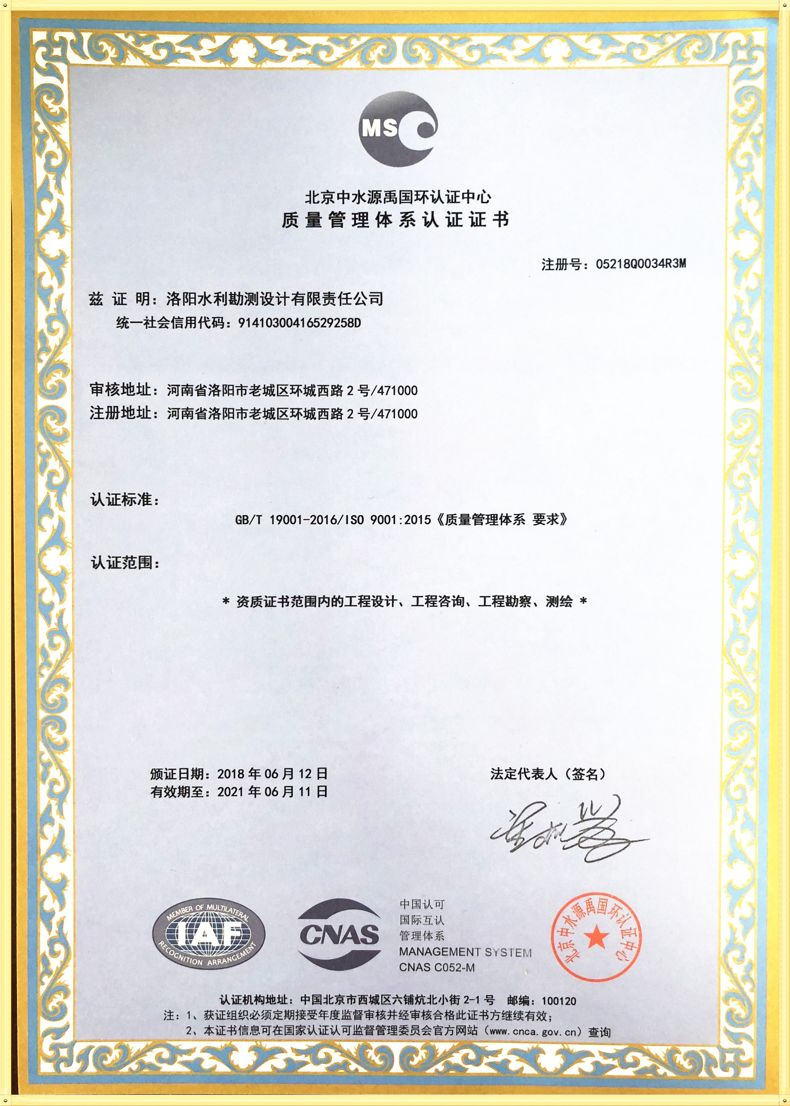 經過北京中水源禹認證中心對我公司進行“質量、環境、職業健康安全管理體系”(簡稱QES)的兩次審核,順利通過取得證書。