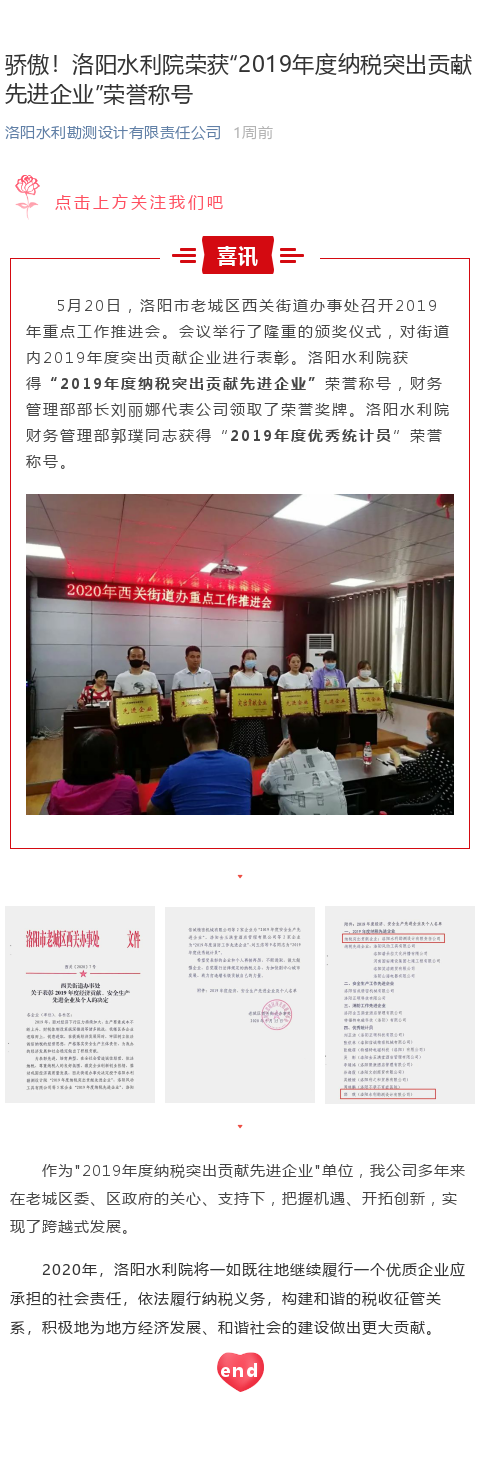 驕傲!洛陽水利院榮獲“2019年度納稅突出貢獻先進企業(yè)”榮譽稱號