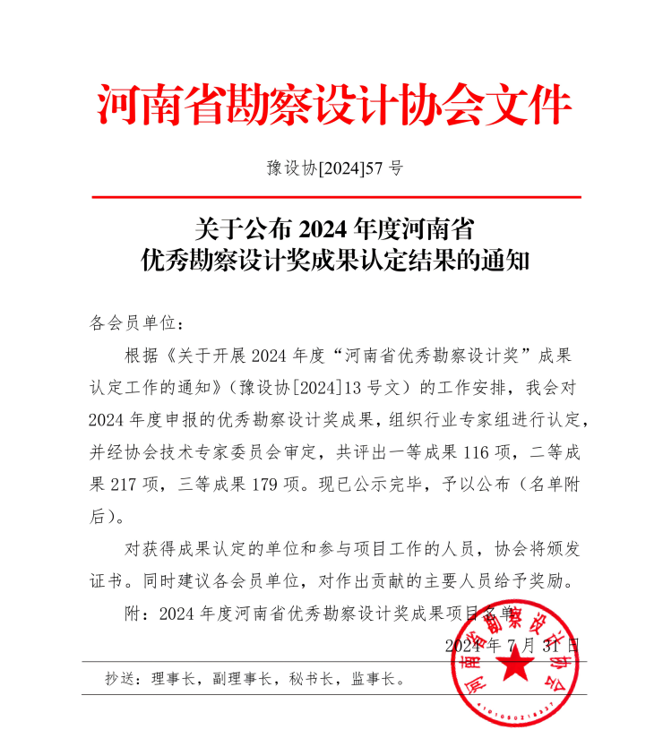 近日,河南省勘察設計協會公布了2024年度河南省優秀勘察設計獎成果,我公司承擔勘察設計的“河南省長垣縣引黃調蓄工程PPP項目”“孟津縣瀍河窯場至九泉水庫段治理工程”等4個項目獲評,其中“河南省長垣縣引黃調蓄工程PPP項目”同時獲評水利類和測繪類二等獎,其他項目分別獲評水利類和勘察類二等獎、三等獎。