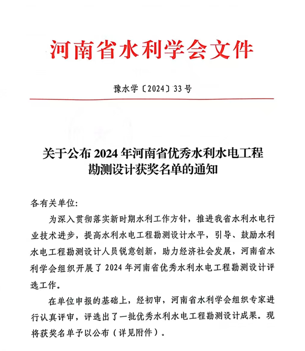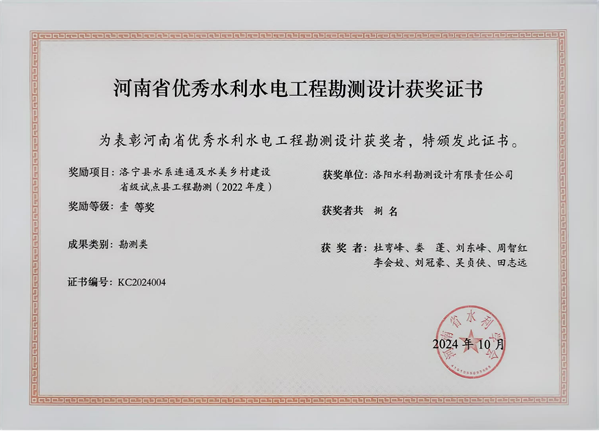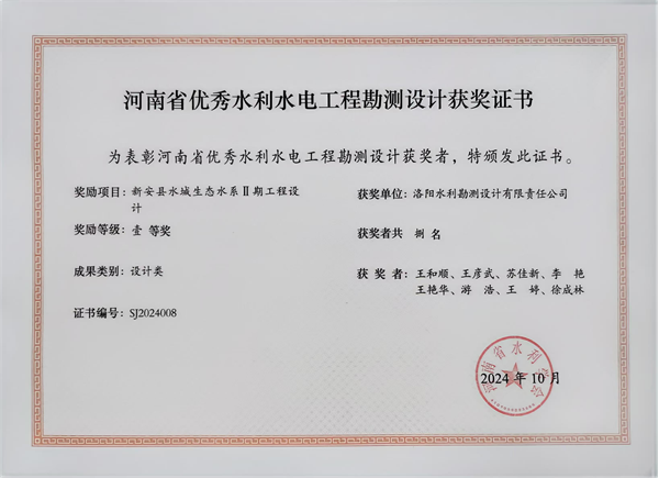 近日,河南省水利學會公布了2024年度河南省優(yōu)秀水利水電工程勘測設(shè)計獎,洛陽水利勘測設(shè)計有限責任公司承擔的“新安縣水城生態(tài)水系Ⅱ期工程設(shè)計”、“洛陽市十四五節(jié)水型社會建設(shè)規(guī)劃”和“洛寧縣水系連通及水美鄉(xiāng)村建設(shè)省級試點縣工程勘測(2022年度)”3個項目,分別榮獲設(shè)計類、技術(shù)咨詢類、勘測類3個一等獎。