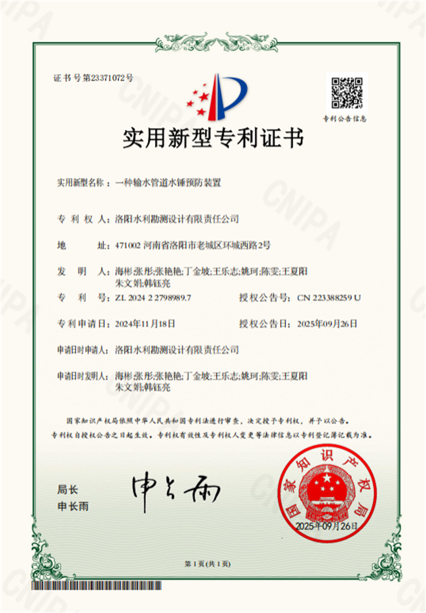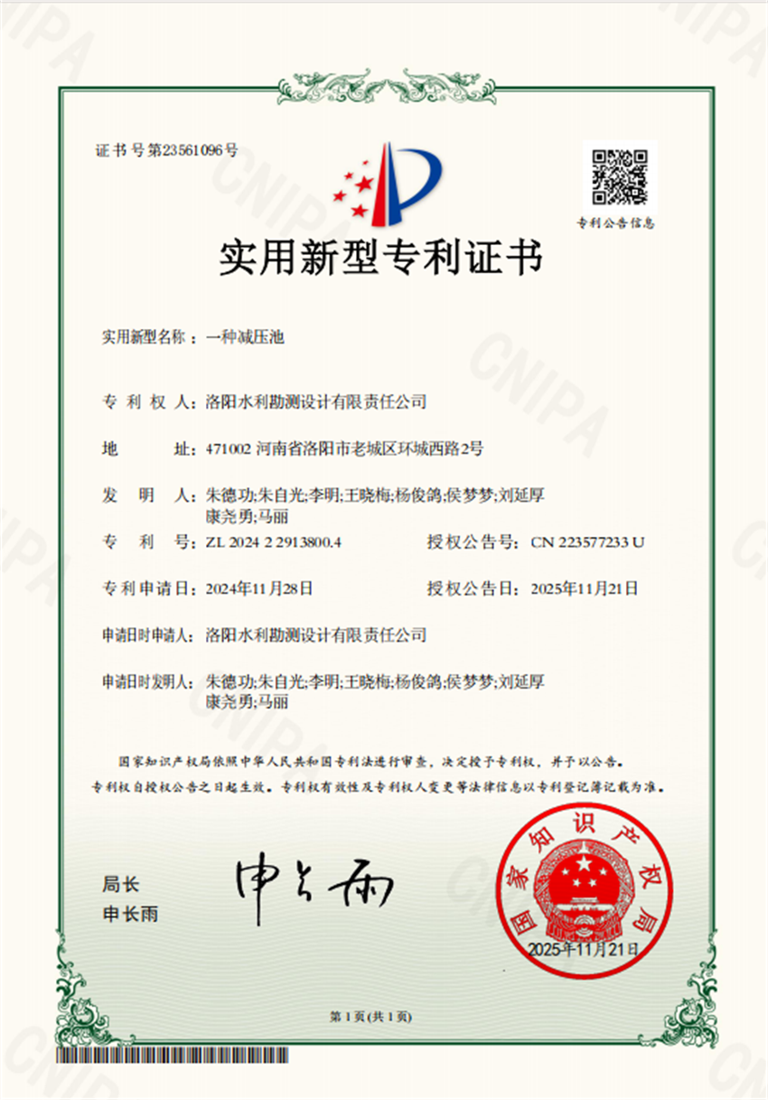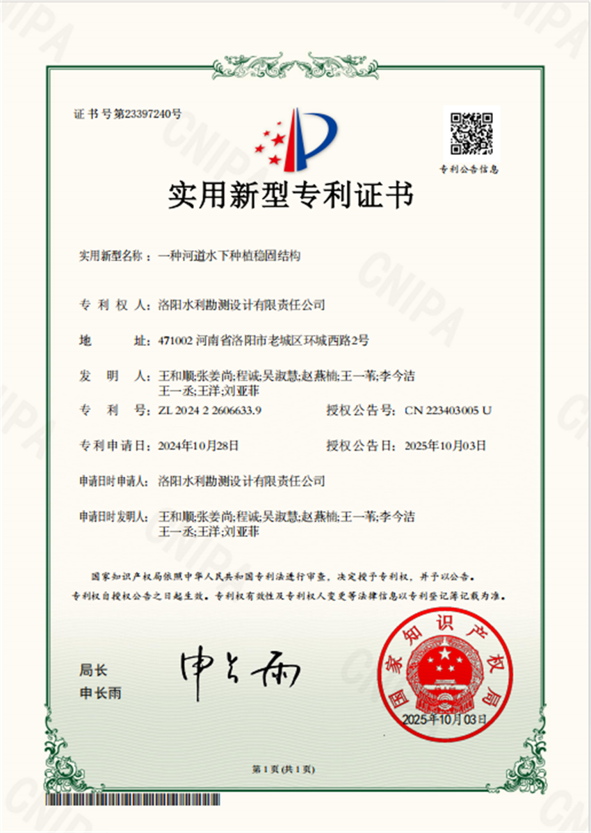 近日,洛陽水利勘測設(shè)計有限責(zé)任公司申報的3項實用新型專利證書“一種河道水下種植穩(wěn)固結(jié)構(gòu)”、“一種輸水管道水錘預(yù)防裝置”和“一種減壓池”成功獲得國家實用新型專利授權(quán)。